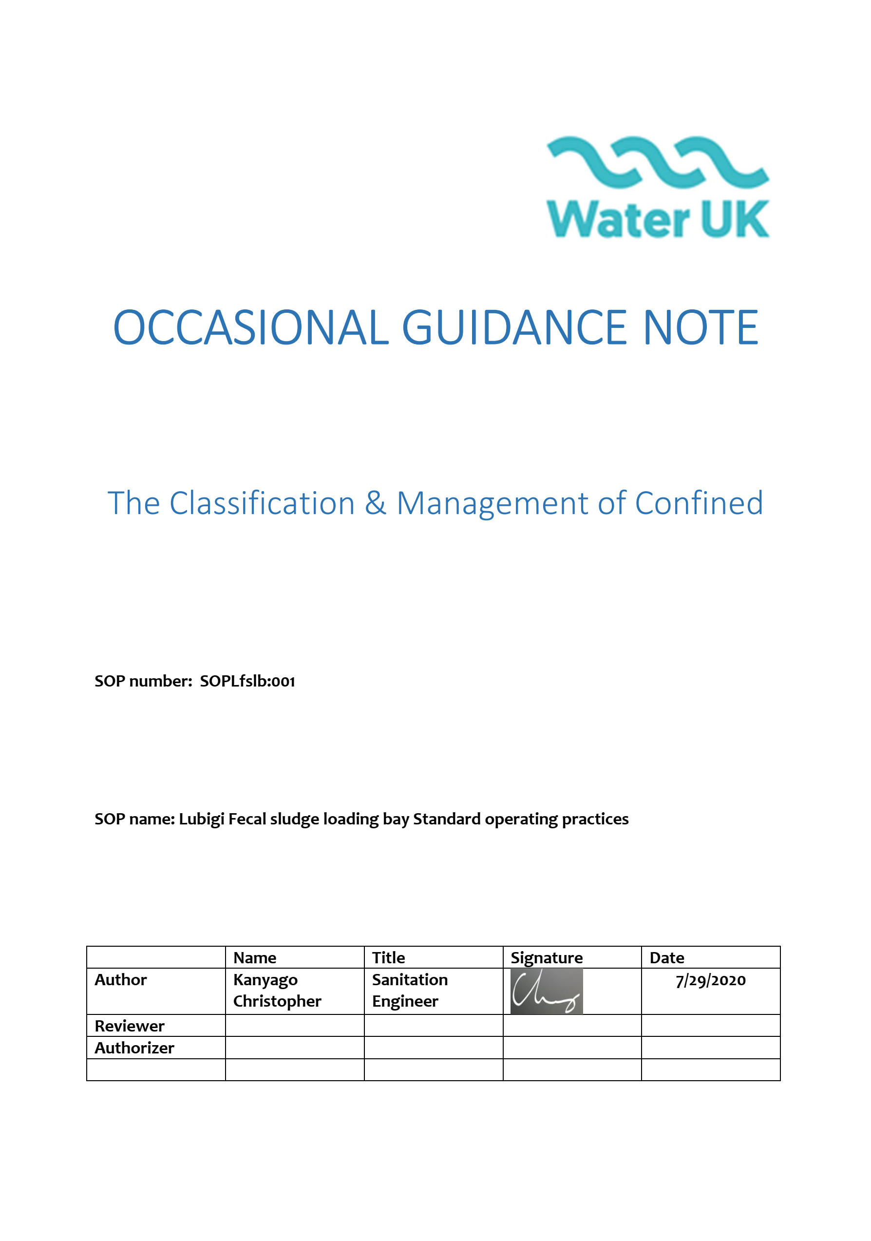 Water for People (WfP) (2020). Lubigi Fecal sludge loading bay Standard operating practices Water for People (WfP)