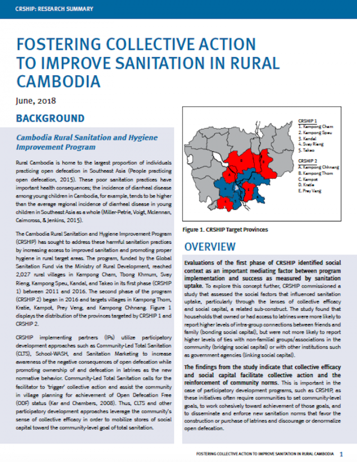 The publication voices the importance of social context and collective action as a mediating factor between programme implementation and its success. CRSHIP assesses the social factors that influenced sanitation uptake, indicating the efficiency of communities participating together with local community leaders or NGOs to work cohesively in achieving their S&H goals.