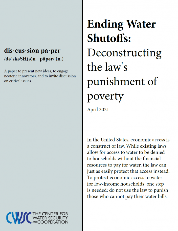 The Center for Water Security and Cooperation (CWSC) recently published two discussion papers analyzing access to water and sanitation. One paper sets forth a global definition of "Access" to water and sanitation to chart a path for lasting progress. The second paper makes the case for repealing laws in the United States that allow water to be shut off to low-income households for their inability […]