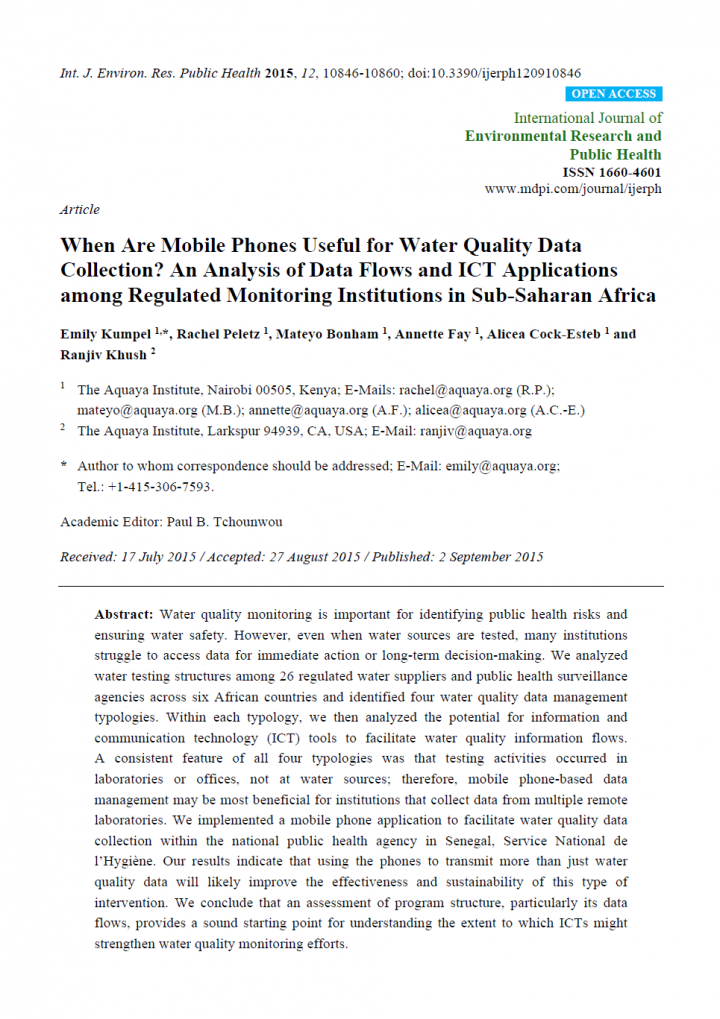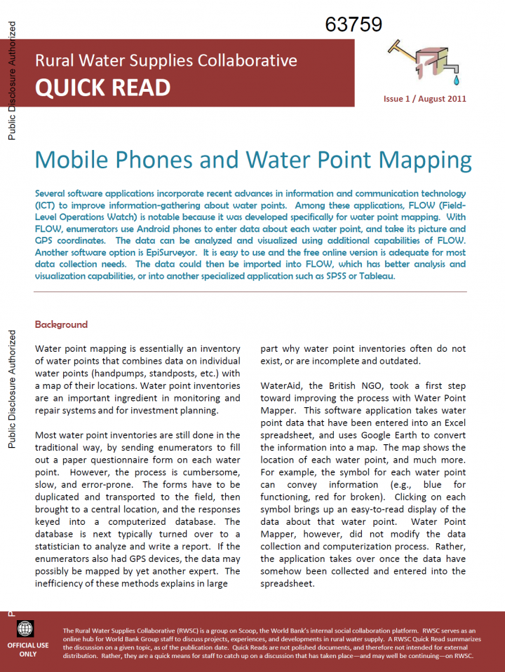 Several software applications incorporate recent advances in information and communication technology (ICT) to improve information gathering about water points. Among these applications, FLOW (Field Level Operations Watch) is not able because it was developed specifically for water point mapping. With FLOW, enumerators use android phones to enter data about each water point, and take its picture and Global Positioning System (GPS) coordinates. The data can […]
