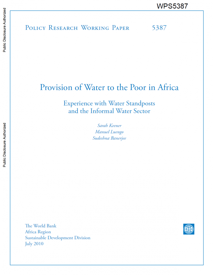 Standpipes that dispense water from utilities are the most common alternatives to piped water connections for poor customers in the cities of Sub-Saharan Africa. Fifty-five percent of the unconnected urban population relies on standpipes as their first water source. Other informal water providers include household resellers and a variety of water tankers and vendors, which are the first water source of 1 percent and 3 […]