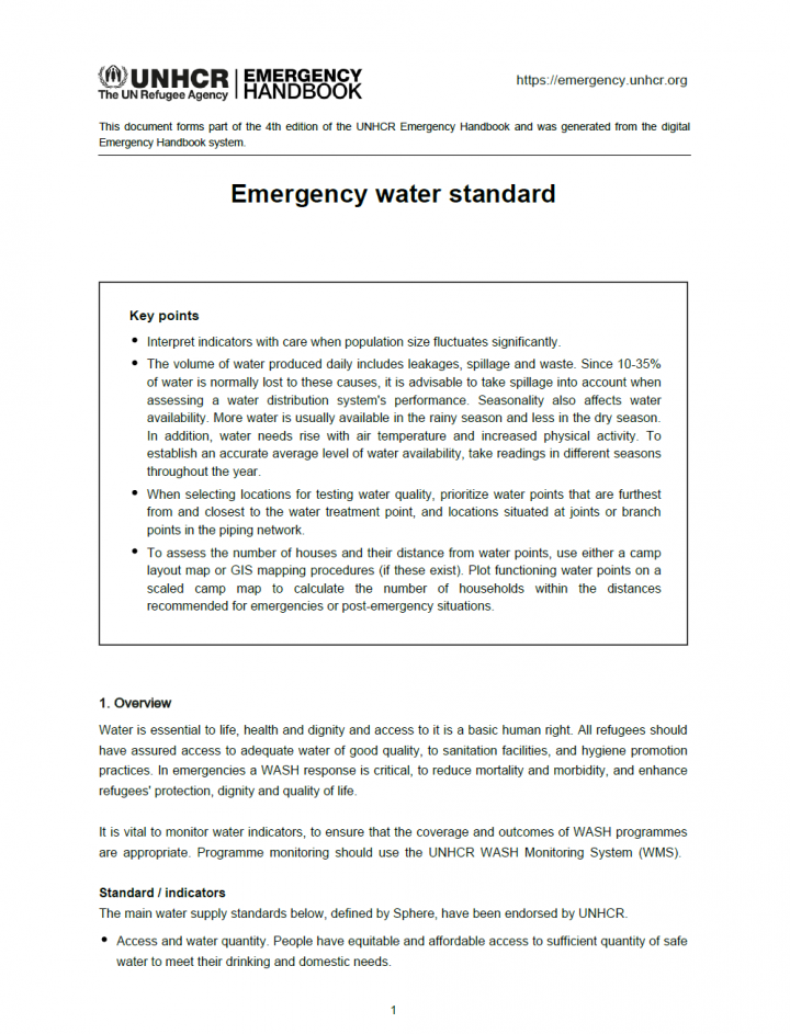 Water is essential to life, health and dignity and access to it is a basic human right. All refugees should have assured access to adequate water of good quality, to sanitation facilities, and hygiene promotion practices. In emergencies a WASH response is critical, to reduce mortality and morbidity, and enhance refugees' protection, dignity and quality of life. It is vital to monitor water indicators, to ensure […]