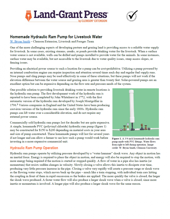 One of the more challenging aspects of developing pasture and grazing land is providing access to a reliable water supply for livestock. In some cases, existing streams, creeks, or ponds provide drinking water for the livestock. When a surface water source is not available, wells can be drilled and pumps installed to provide water for the animals. In some instances, surface water may be available, […]
