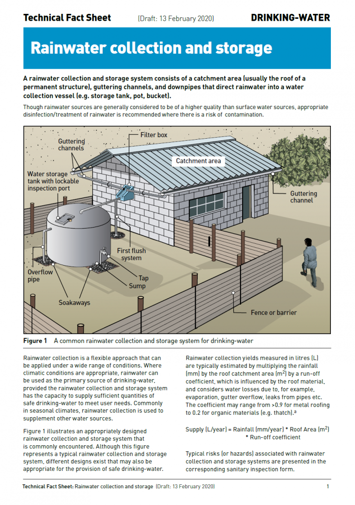 This sanitary inspection package for a rainwater collection and storage contains: 1. Sanitary inspection form Checklist of observational questions to support the identification of risk factors and prompt corrective action. 2. Technical fact sheet Basic technical information to support the completion of the sanitary inspection form. 3. Management advice sheet Operations and maintenance information to support the safe management of the drinking-water system, and troubleshoot basic issues.