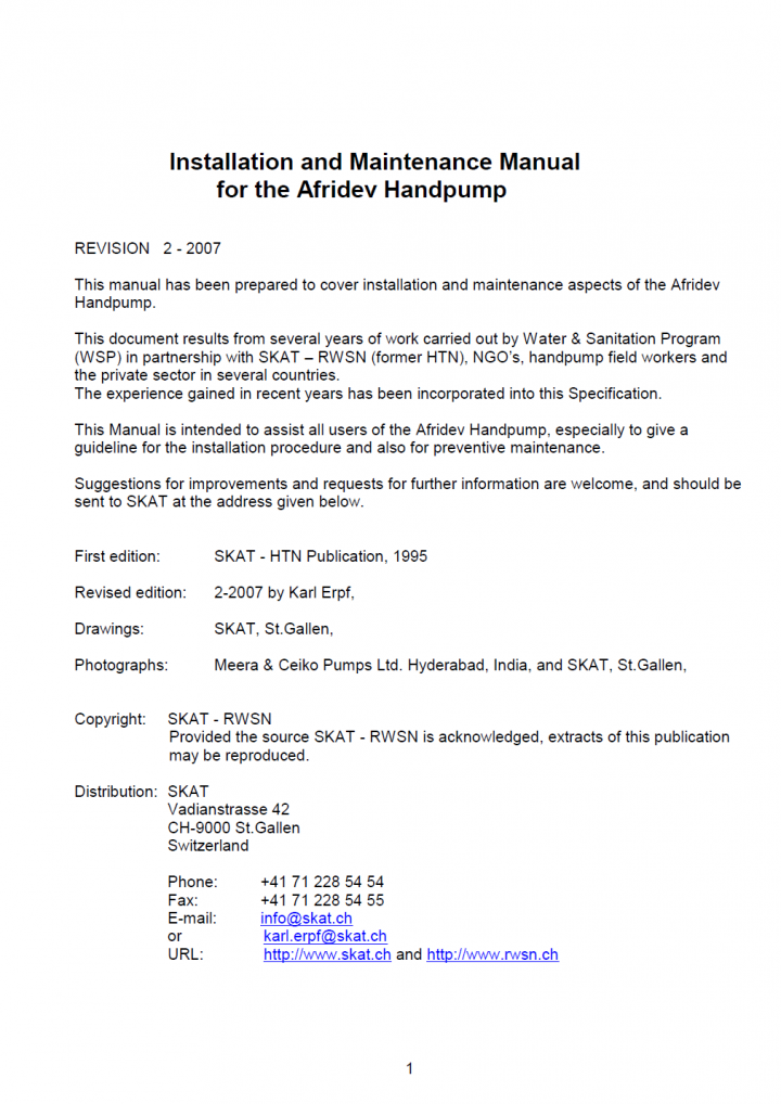 This manual has been prepared to cover installation and maintenance aspects of the Afridev Handpump. This document results from several years of work carried out by Water & Sanitation Program (WSP) in partnership with SKAT – RWSN (former HTN), NGO’s, handpump field workers and the private sector in several countries. The experience gained in recent years has been incorporated into this Specification. This Manual is […]