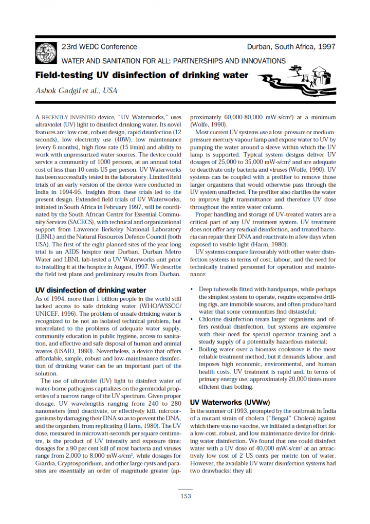 As of 1994, more than 1 billion people in the world still lacked access to safe drinking water (WHO/WSSCC/ UNICEF, 1996). The problem of unsafe drinking water is recognized to be not an isolated technical problem, but interrelated to the problems of adequate water supply, community education in public hygiene, access to sanitation, and effective and safe disposal of human and animal wastes (USAID, 1990). […]