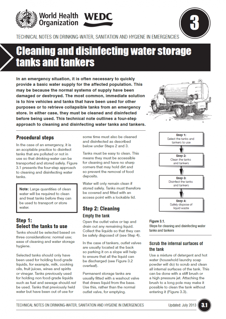 In an emergency situation, it is often necessary to quickly provide a basic water supply for the affected population. This may be because the normal systems of supply have been damaged or destroyed. The most common, immediate solution is to hire vehicles and tanks that have been used for other purposes or to retrieve collapsible tanks from an emergency store. In either case, they must […]