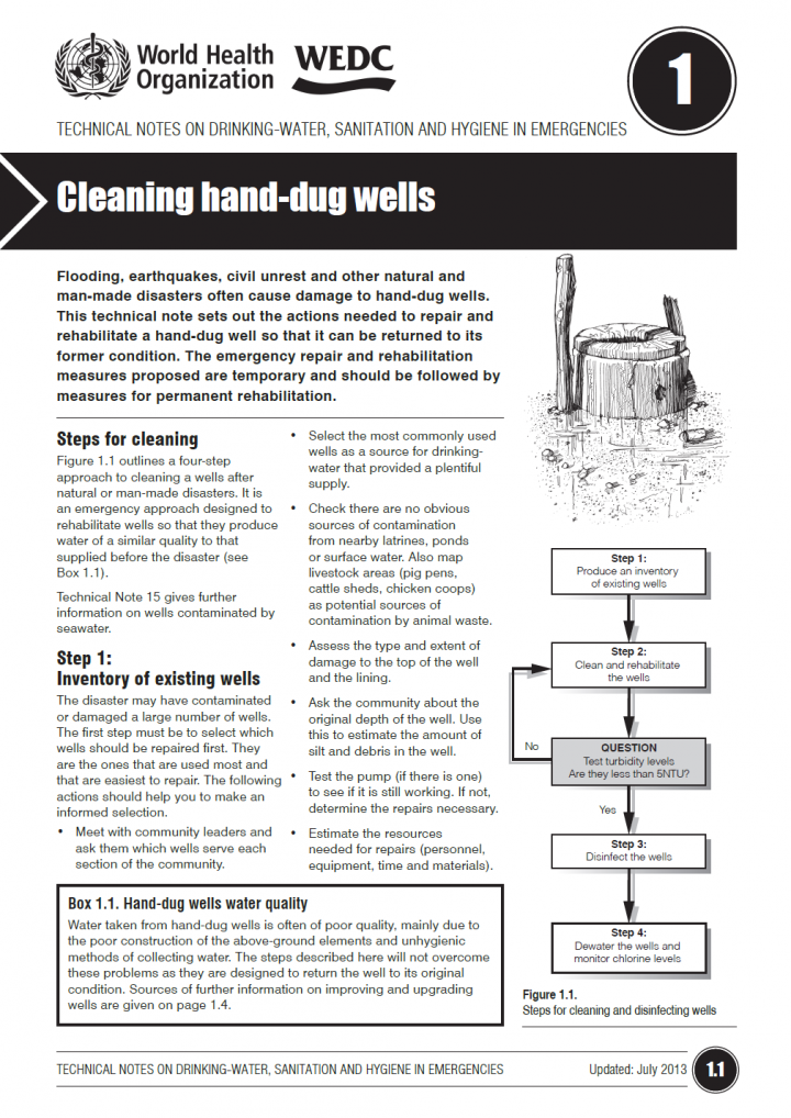 Flooding, earthquakes, civil unrest and other natural and man-made disasters often cause damage to hand-dug wells. This technical note sets out the actions needed to repair and rehabilitate a hand-dug well so that it can be returned to its former condition. The emergency repair and rehabilitation measures proposed are temporary and should be followed by measures for permanent rehabilitation.