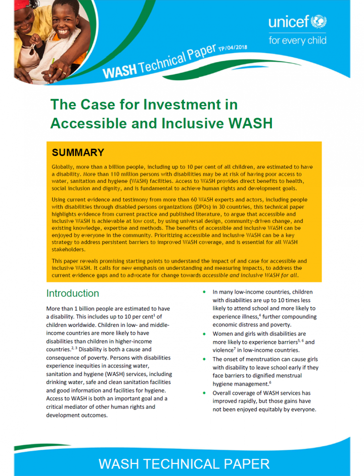 Globally, more than a billion people, including up to 10 per cent of all children, are estimated to have a disability. More than 110 million persons with disabilities may be at risk of having poor access to water, sanitation and hygiene (WASH) facilities. Access to WASH provides direct benefits to health, social inclusion and dignity, and is fundamental to achieve human rights and development goals. […]