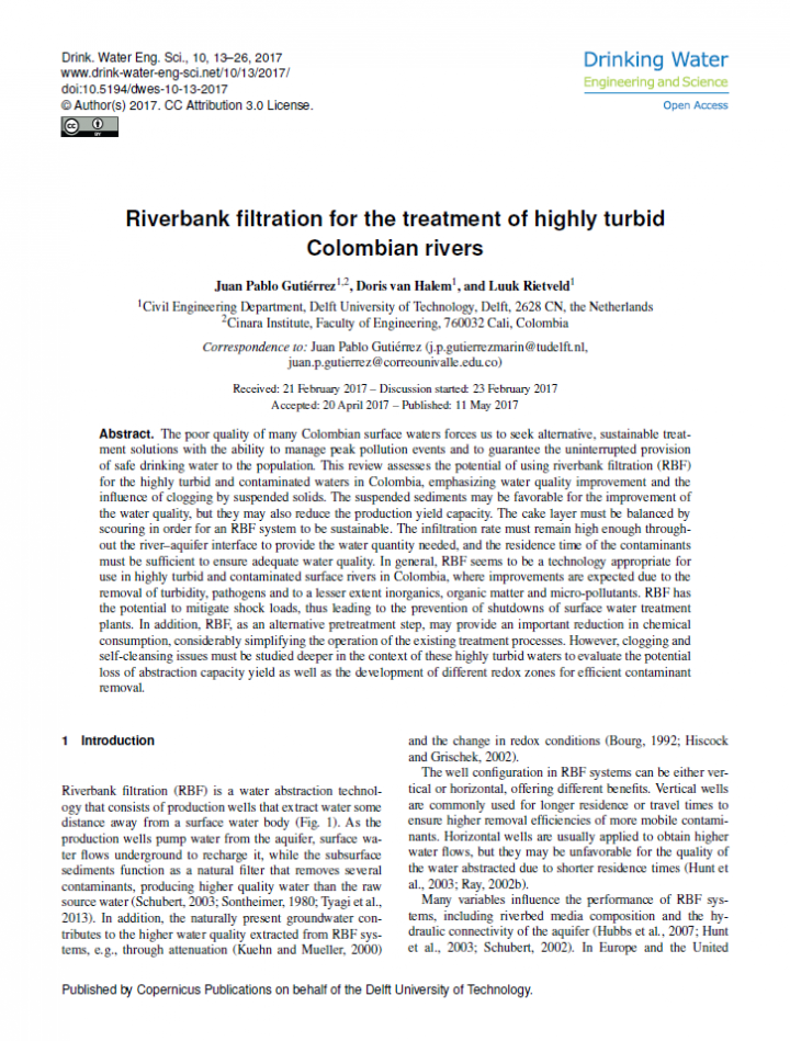 The poor quality of many Colombian surface waters forces us to seek alternative, sustainable treatment solutions with the ability to manage peak pollution events and to guarantee the uninterrupted provision of safe drinking water to the population. This review assesses the potential of using riverbank filtration (RBF) for the highly turbid and contaminated waters in Colombia, emphasizing water quality improvement and the influence of clogging […]