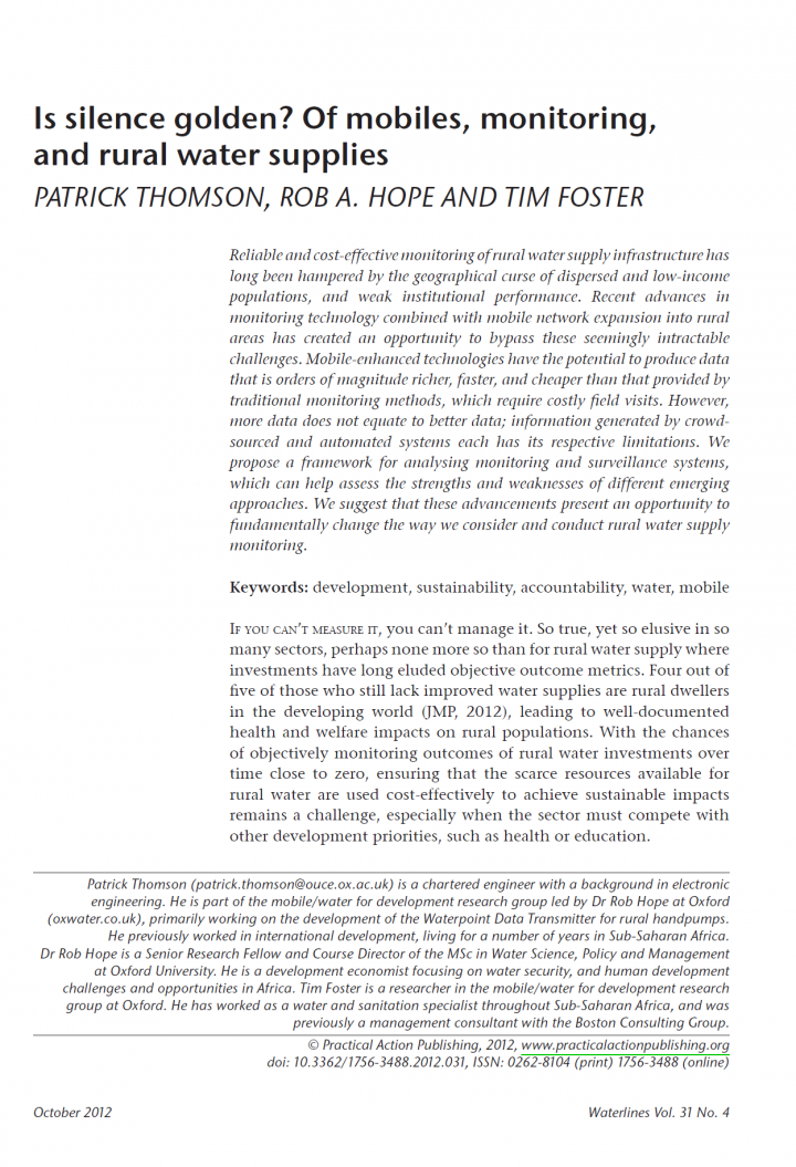 Reliable and cost-effective monitoring of rural water supply infrastructure has long been hampered by the geographical curse of dispersed and low-income populations, and weak institutional performance. Recent advances in monitoring technology combined with mobile network expansion into rural areas has created an opportunity to bypass these seemingly intractable challenges. Mobile-enhanced technologies have the potential to produce data that is orders of magnitude richer, faster, and […]