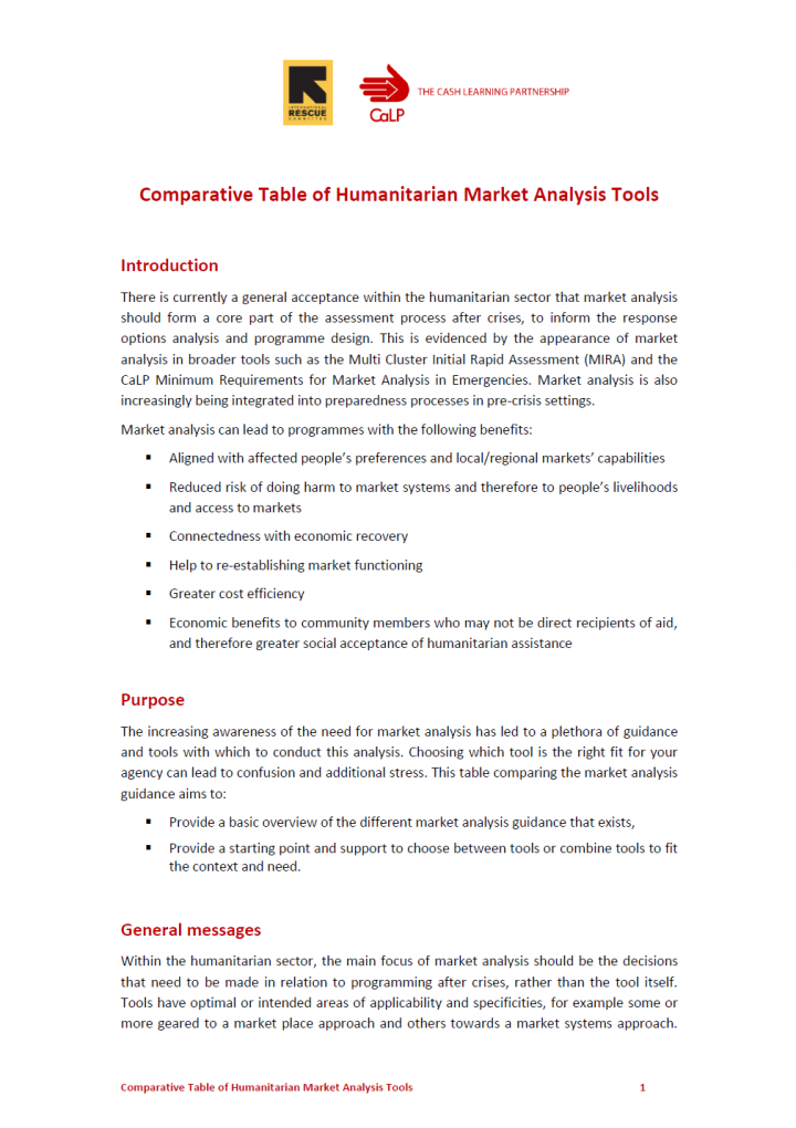There is currently a general acceptance within the humanitarian sector that market analysis should form a core part of the assessment process after crises, to inform the response options analysis and programme design. This is evidenced by the appearance of market analysis in broader tools such as the Multi Cluster Initial Rapid Assessment (MIRA) and the CaLP Minimum Requirements for Market Analysis in […]
