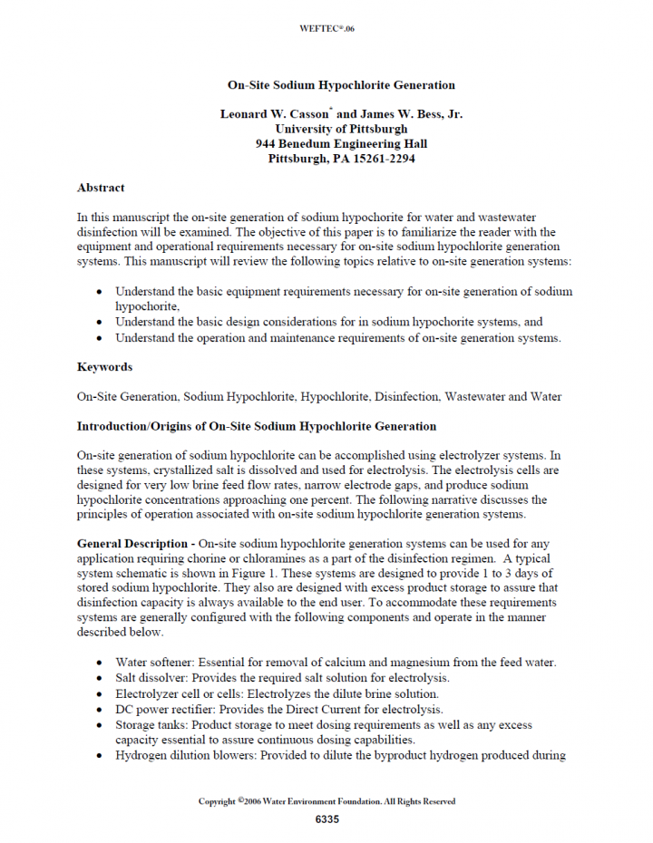 In this manuscript the on-site generation of sodium hypochorite for water and wastewater disinfection will be examined. The objective of this paper is to familiarize the reader with the equipment and operational requirements necessary for on-site sodium hypochlorite generation systems. This manuscript will review the following topics relative to on-site generation systems: Understand the basic equipment requirements necessary for on-site generation of sodium hypochorite, Understand […]