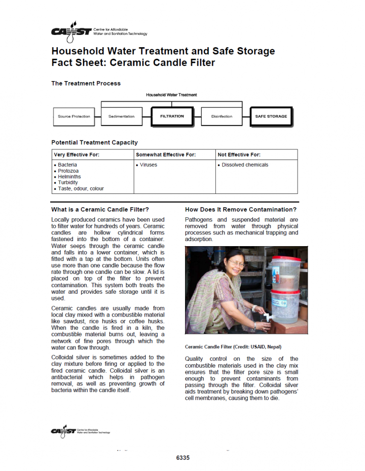 Locally produced ceramics have been used to filter water for hundreds of years. Ceramic candles are hollow cylindrical forms fastened into the bottom of a container. Water seeps through the ceramic candle and falls into a lower container, which is fitted with a tap at the bottom. Units often use more than one candle because the flow rate through one candle can be slow. A […]