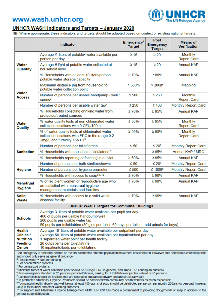 A summary of UNHCR water, excreta management, solid waste management, disease vector control and hygiene promotion indicators and targets for emergency and post emergency refugee settings including means of verification.