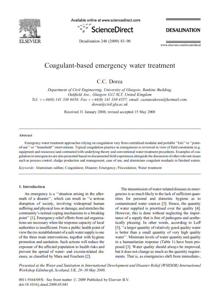 Emergency water treatment approaches relying on coagulation vary from centralised modular and portable ‘‘kits’’ to ‘‘pointof-use’’ or ‘‘household’’ interventions. Typical coagulation practice in emergencies is reviewed in view of field constraints (e.g. equipment and resources) and contrasted with underlying theory and conventional water treatment procedures. Examples of coagulation in emergencies are also presented based on documented field experiences alongside the discussion of other relevant issues […]