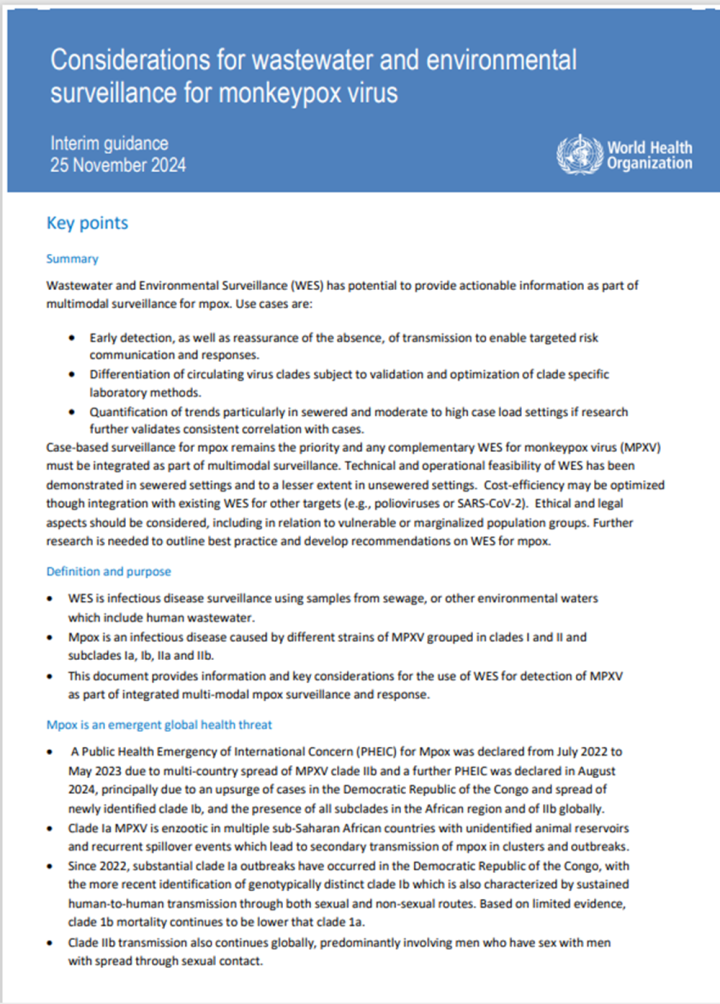 "Wastewater and environmental surveillance (WES) has potential to provide actionable information as part of multimodal surveillance for mpox. Use cases are; early detection, as well as reassurance of the absence, of transmission to enable targeted risk communication and responses, differentiation of circulating virus clades subject to validation and optimization of clade specific laboratory methods, and quantification of trends particularly in sewered and moderate to high […]