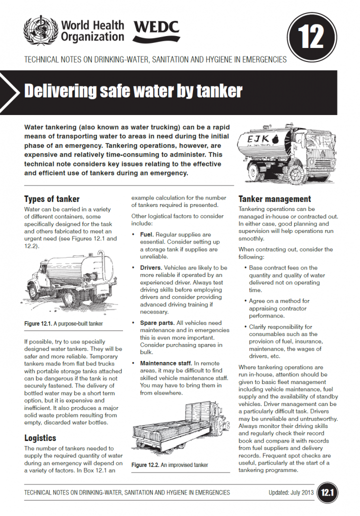Water tankering (also known as water trucking) can be a rapid means of transporting water to areas in need during the initial phase of an emergency. Tankering operations, however, are expensive and relatively time-consuming to administer. This technical note considers key issues relating to the effective and efficient use of tankers during an emergency.