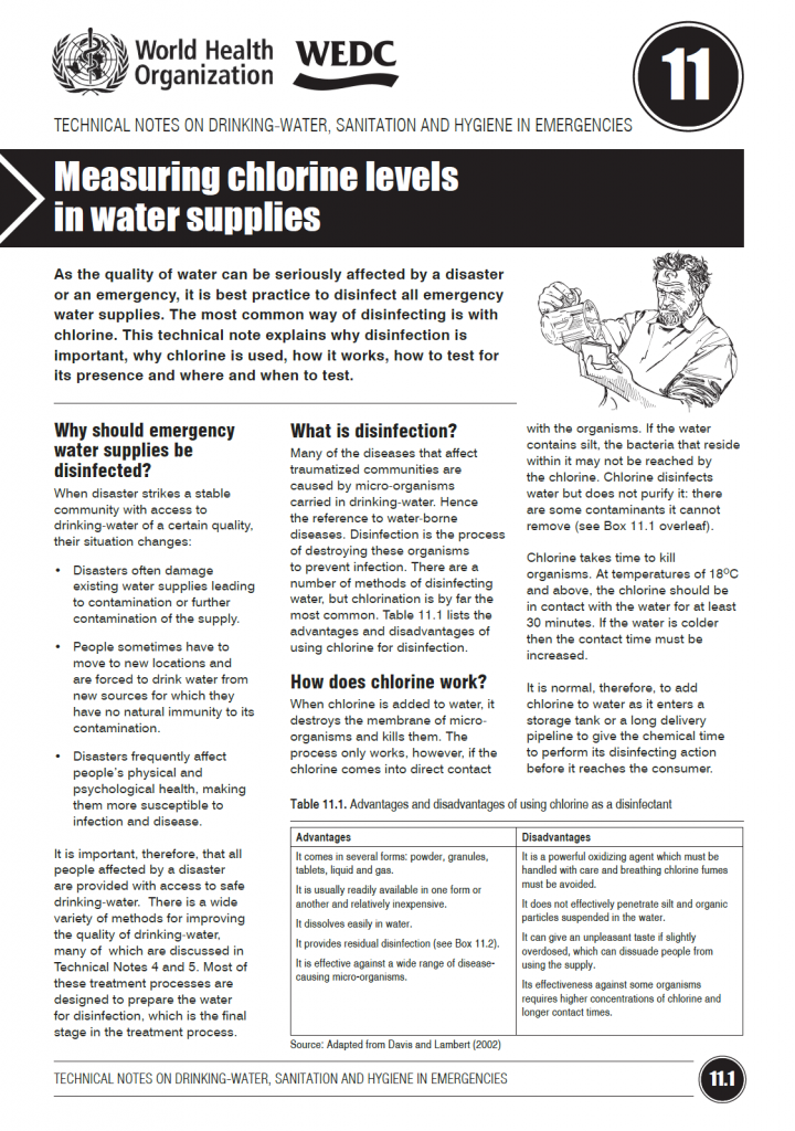 As the quality of water can be seriously affected by a disaster or an emergency, it is best practice to disinfect all emergency water supplies. The most common way of disinfecting is with chlorine. This technical note explains why disinfection is important, why chlorine is used, how it works, how to test for its presence and where and when to test.