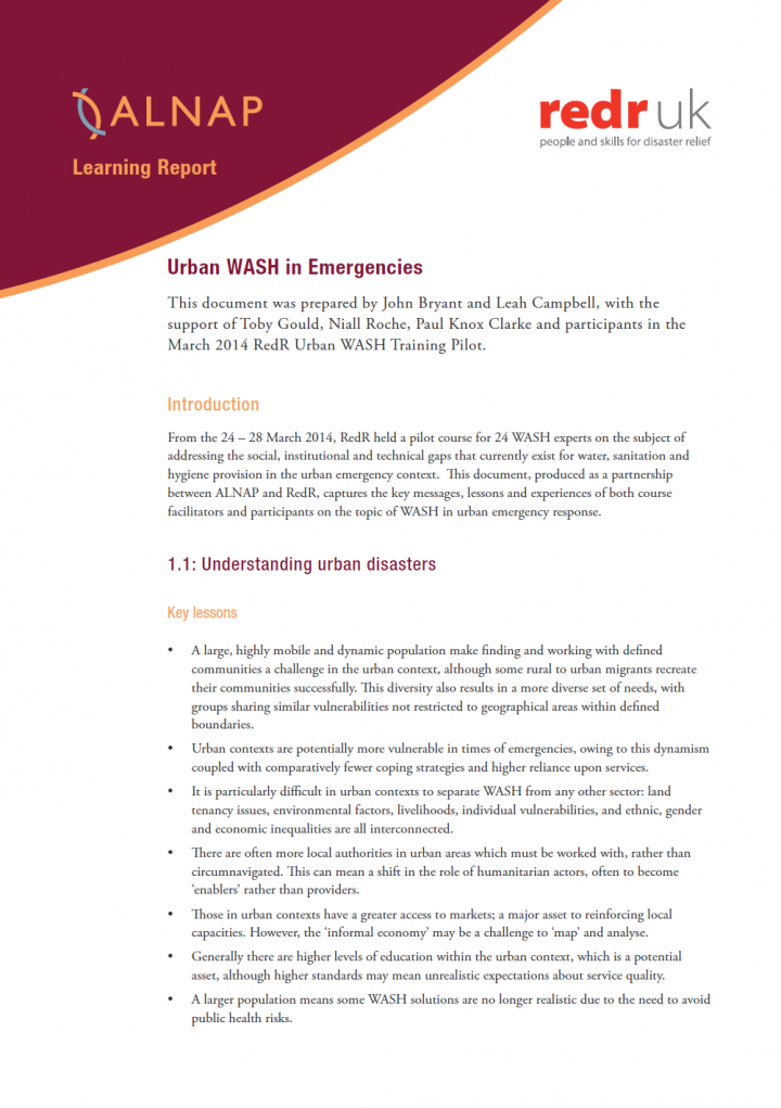 From the 24 – 28 March 2014, RedR held a pilot course for 24 WASH experts on the subject of addressing the social, institutional and technical gaps that currently exist for water, sanitation and hygiene provision in the urban emergency context. This document, produced as a partnership between ALNAP and RedR, captures the key messages, lessons and experiences of both course facilitators and participants on […]