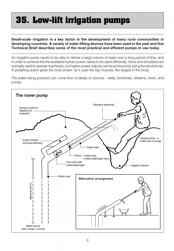 Small-scale irrigation is a key factor in the development of many rural communities in developing countries. A variety of water-lifting devices have been used in the past and this Technical Brief describes some of the most practical and efficient pumps in use today.