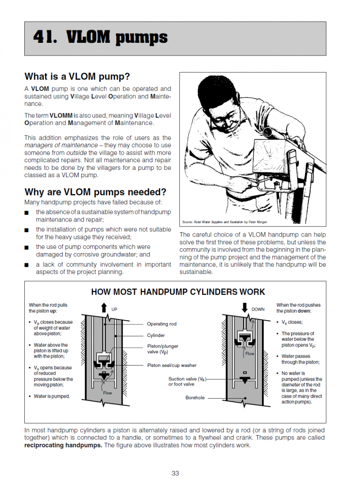 A VLOM pump is one which can be operated and sustained using Village Level Operation and Maintenance. The term VLOMM is also used, meaning Village Level Operation and Management of Maintenance. This addition emphasizes the role of users as the managers of maintenance – they may choose to use someone from outside the village to assist with more complicated repairs. Not all maintenance and repair […]
