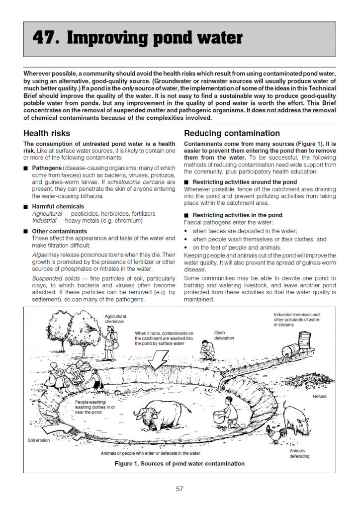 Wherever possible, a community should avoid the health risks which result from using contaminated pond water, by using an alternative, good-quality source. (Groundwater or rainwater sources will usually produce water of much better quality.) If a pond is the only source of water, the implementation of some of the ideas in this Technical Brief should improve the quality of the water. It is not easy […]