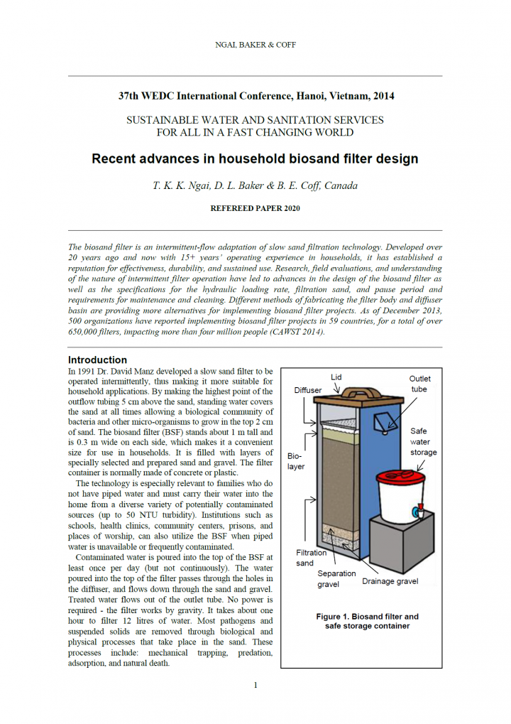 The biosand filter is an intermittent-flow adaptation of slow sand filtration technology. Developed over 20 years ago and now with 15+ years’ operating experience in households, it has established a reputation for effectiveness, durability, and sustained use. Research, field evaluations, and understanding of the nature of intermittent filter operation have led to advances in the design of the biosand filter as well as the specifications […]