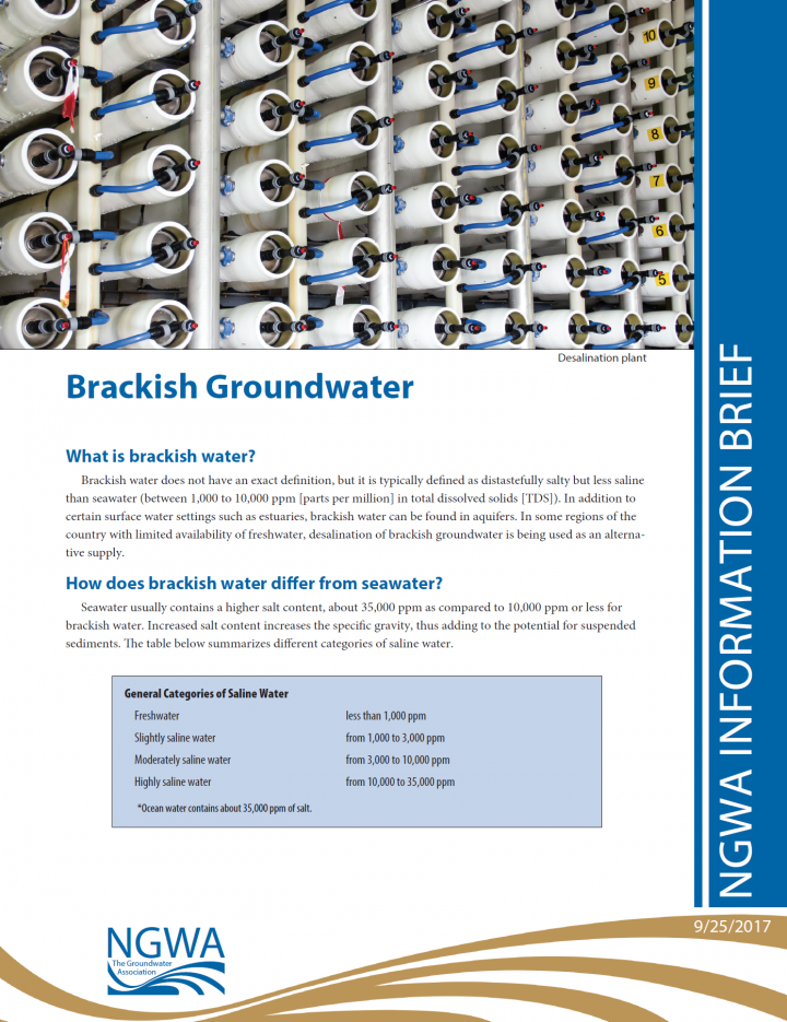 Brackish water does not have an exact definition, but it is typically defined as distastefully salty but less saline than seawater (between 1,000 to 10,000 ppm [parts per million] in total dissolved solids [TDS]). In addition to certain surface water settings such as estuaries, brackish water can be found in aquifers. In some regions of the country with limited availability of freshwater, desalination of brackish […]