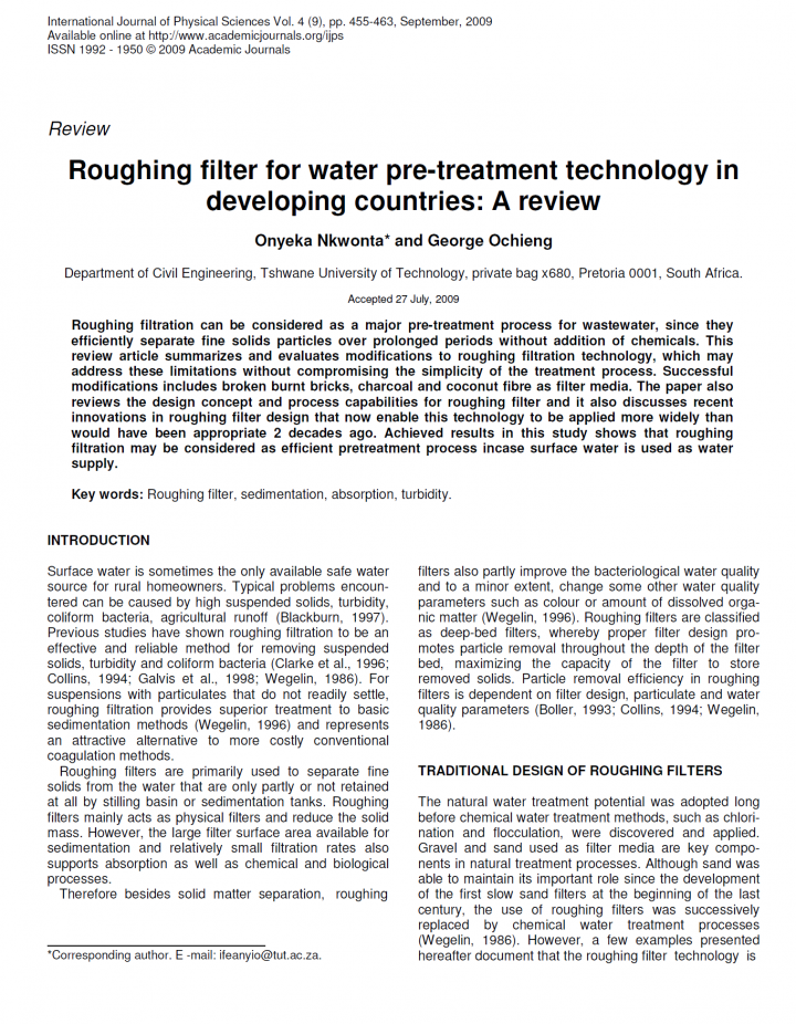Roughing filtration can be considered as a major pre-treatment process for wastewater, since they efficiently separate fine solids particles over prolonged periods without addition of chemicals. This review article summarizes and evaluates modifications to roughing filtration technology, which may address these limitations without compromising the simplicity of the treatment process. Successful modifications includes broken burnt bricks, charcoal and coconut fibre as filter media. The paper […]