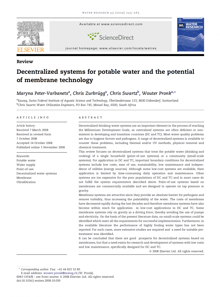 Decentralized drinking-water systems are an important element in the process of reaching the Millennium Development Goals, as centralized systems are often deficient or non-existent in developing and transition countries (DC and TC). Most water-quality problems are due to hygiene factors and pathogens. A range of decentralized systems is available to counter these problems, including thermal and/or UV methods, physical removal and chemical treatment. This review focuses […]
