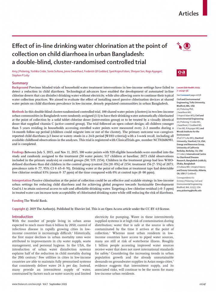 Previous blinded trials of household water treatment interventions in low-income settings have failed to detect a reduction in child diarrhoea. Technological advances have enabled the development of automated in-line chlorine dosers that can disinfect drinking water without electricity, while also allowing users to continue their typical water collection practices. We […]