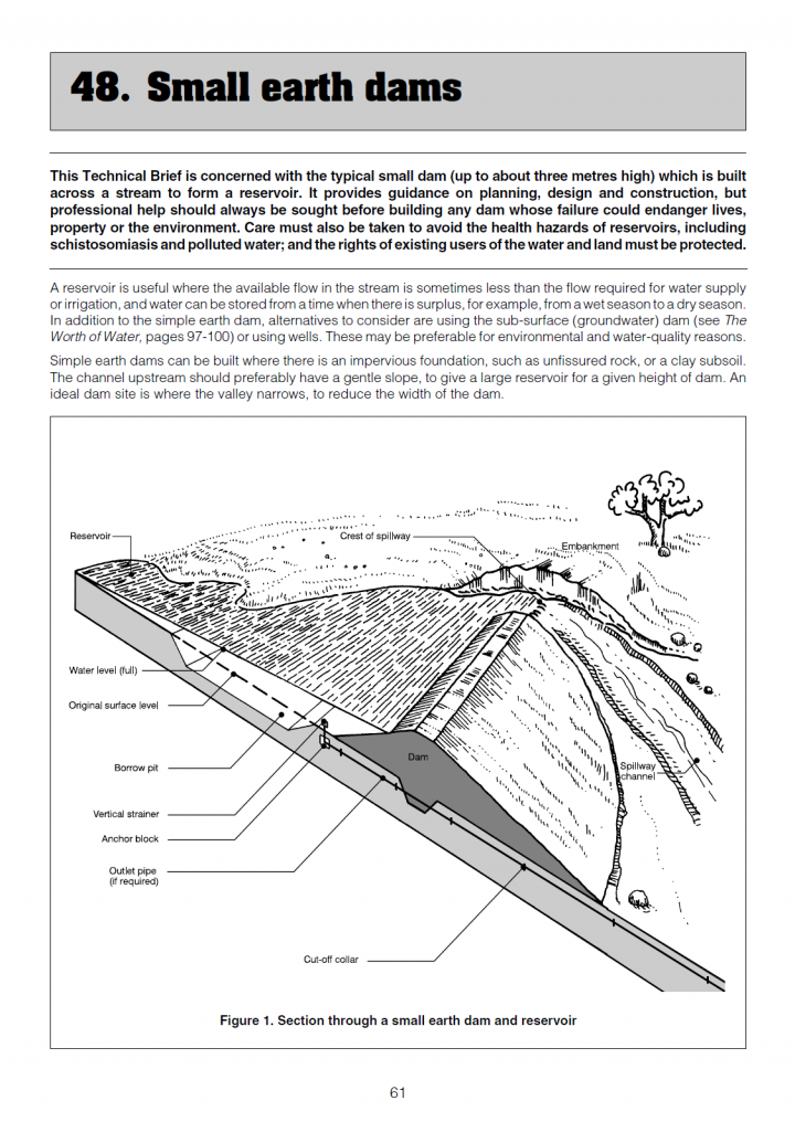 This Technical Brief is concerned with the typical small dam (up to about three metres high) which is built across a stream to form a reservoir. It provides guidance on planning, design and construction, but professional help should always be sought before building any dam whose failure could endanger lives, property or the environment. Care must also be taken to avoid the health hazards of […]