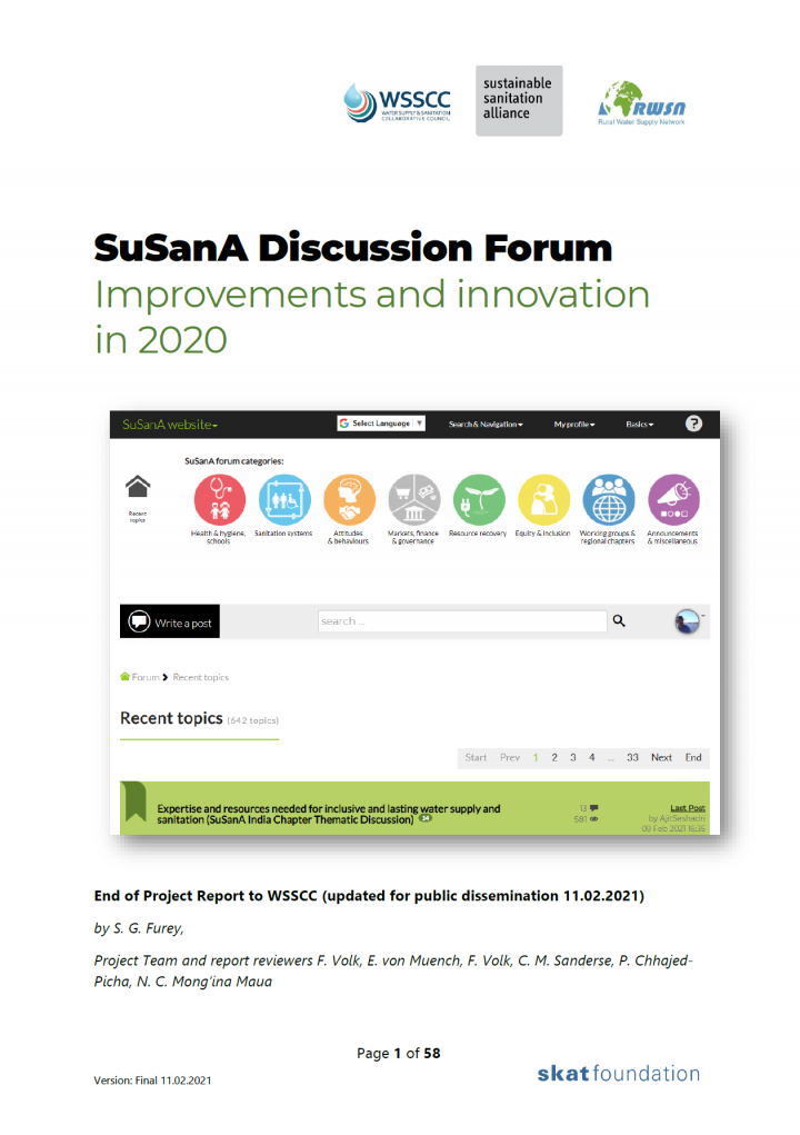 From the executive summary: • This report summarises the work done under a grant from WSSCC (via UNOPS Geneva) to Skat Foundation to run and develop the SuSanA Forum. • The SuSanA Forum is a well-established, vibrant online community within the sanitation sector and a major global knowledge exchange hub on topics relating to practical implementation, research and policy. It is an essential part of the […]