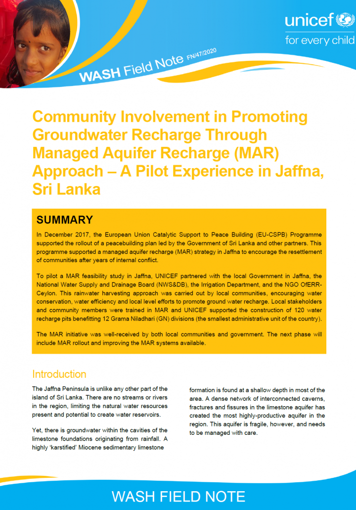 In December 2017, the European Union Catalytic Support to Peace Building (EU-CSPB) Programme supported the rollout of a peacebuilding plan led by the Government of Sri Lanka and other partners. This programme supported a managed aquifer recharge (MAR) strategy in Jaffna to encourage the resettlement of communities after years of internal conflict. To pilot a MAR feasibility study in Jaffna, UNICEF partnered with the local […]