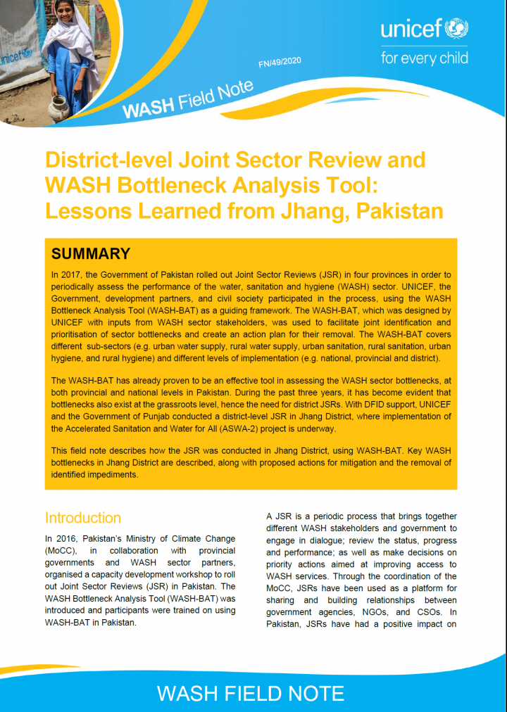 In 2017, the Government of Pakistan rolled out Joint Sector Reviews (JSR) in four provinces in order to periodically assess the performance of the water, sanitation and hygiene (WASH) sector. UNICEF, the Government, development partners, and civil society participated in the process, using the WASH Bottleneck Analysis Tool (WASH-BAT) as a guiding framework. The WASH-BAT, which was designed by UNICEF with inputs from WASH sector […]