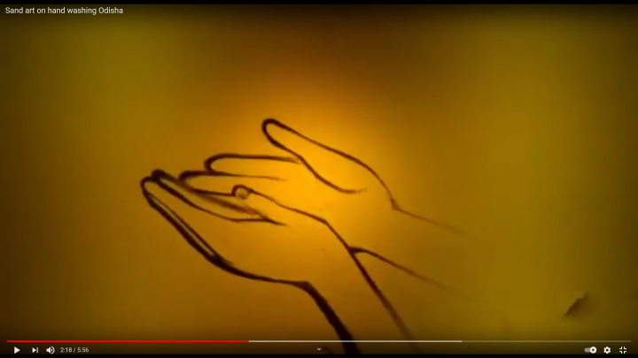 This short video promotes handwashing with soap using sand art as the medium. The commentary is in Odiya.