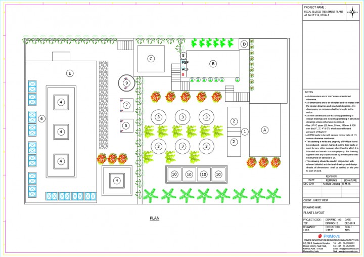 This is a set of technical drawings for a FSTP built at Wayanad, Kerala. It will be useful for designers of FSTPs for small and medium towns. The schematics are provided in metric units. It has top views, hydraulic flows, unloading platform, screen chamber details, anaerobic digester, intermediate storage tank, drying beds, tiger bio-filters and the overall plan.