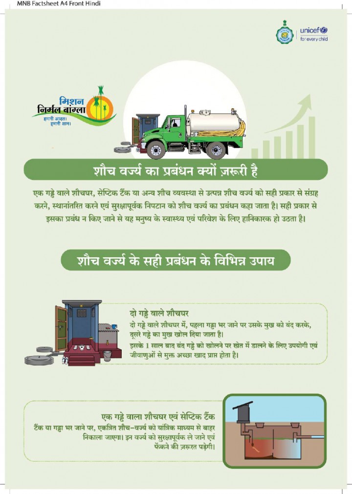 West Bengal has developed a poster that depicts the techniques involved in managing faecal waste and lists the roles and responsibilities of village functionaries in adopting and promoting FSM in the second phase of the Swachh Bharat Mission. In Hindi, this two-page poster provides an overview for the public on FSM.