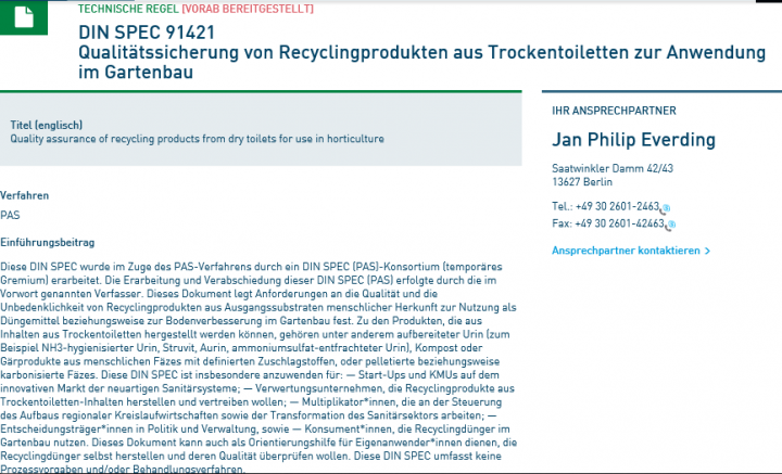 Diese DIN SPEC wurde im Zuge des PAS-Verfahrens durch ein DIN SPEC (PAS)-Konsortium (temporäres Gremium) erarbeitet. Die Erarbeitung und Verabschiedung dieser DIN SPEC (PAS) erfolgte durch die im Vorwort genannten Verfasser. Dieses Dokument legt Anforderungen an die Qualität und die Unbedenklichkeit von Recyclingprodukten aus Ausgangssubstraten menschlicher Herkunft zur Nutzung als Düngemittel beziehungsweise zur Bodenverbesserung im Gartenbau fest. Zu den Produkten, die aus Inhalten aus Trockentoiletten […]