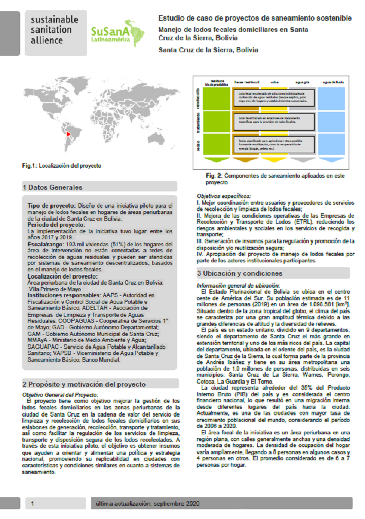 El proyecto tiene como objetivo mejorar la gestión de los lodos fecales domiciliarios en las zonas periurbanas de la ciudad de Santa Cruz en la cadena de valor del servicio de limpieza y recolección de lodos fecales domiciliarios en sus eslabones de generación, recolección, transporte y tratamiento,así como facilitar la regulación de los servicios de limpieza, transporte y disposición segura de los lodos recolectados.