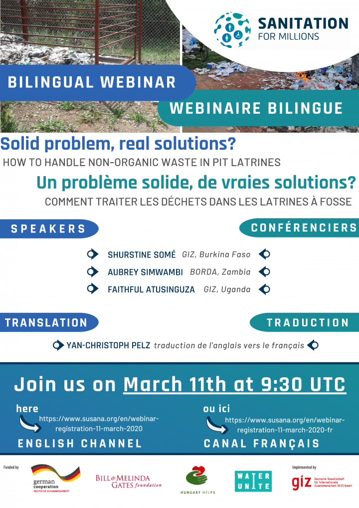 This webinar brought together two GIZ programmes working on access to safe sanitation along the entire sanitation service chain: Scaling up of Drinking Water and Sanitation Supply in Burkina Faso and Sanitation for Millions (project component Uganda). Joined by BORDA Zambia, implementing experts from the three countries presented their experiences from the field: • Behaviour: Why do users throw solid waste such as used menstrual pads into […]