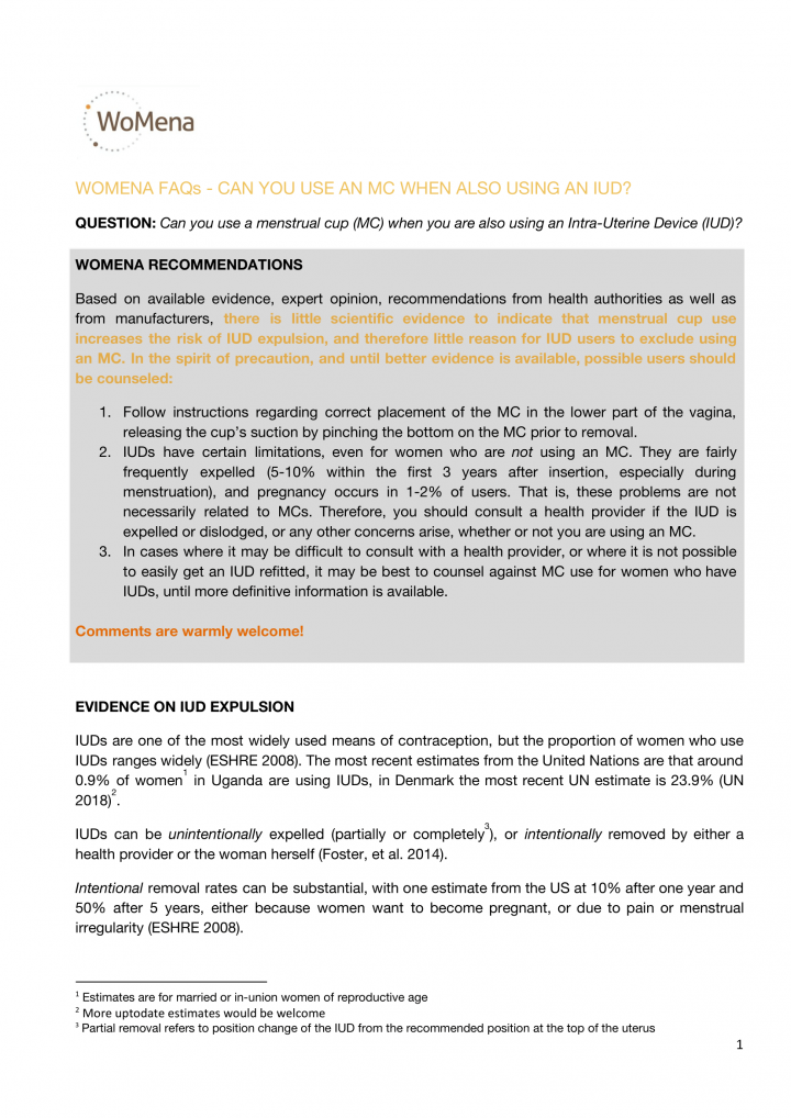 WOMENA RECOMMENDATIONS Based on available evidence, expert opinion, recommendations from health authorities as well as from manufacturers, there is little scientific evidence to indicate that menstrual cup use increases the risk of IUD expulsion, and therefore little reason for IUD users to exclude using an MC. In the spirit of precaution, and until better evidence is available, possible users should be counseled: 1. Follow instructions regarding correct […]