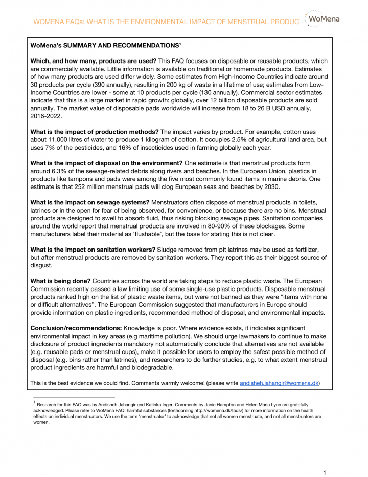 WoMena’s SUMMARY AND RECOMMENDATIONS Which, and how many, products are used? This FAQ focuses on disposable or reusable products, which are commercially available. Little information is available on traditional or homemade products. Estimates of how many products are used differ widely. Some estimates from High-Income Countries indicate around 30 products per cycle (390 annually), resulting in 200 kg of waste in a lifetime of use; estimates […]