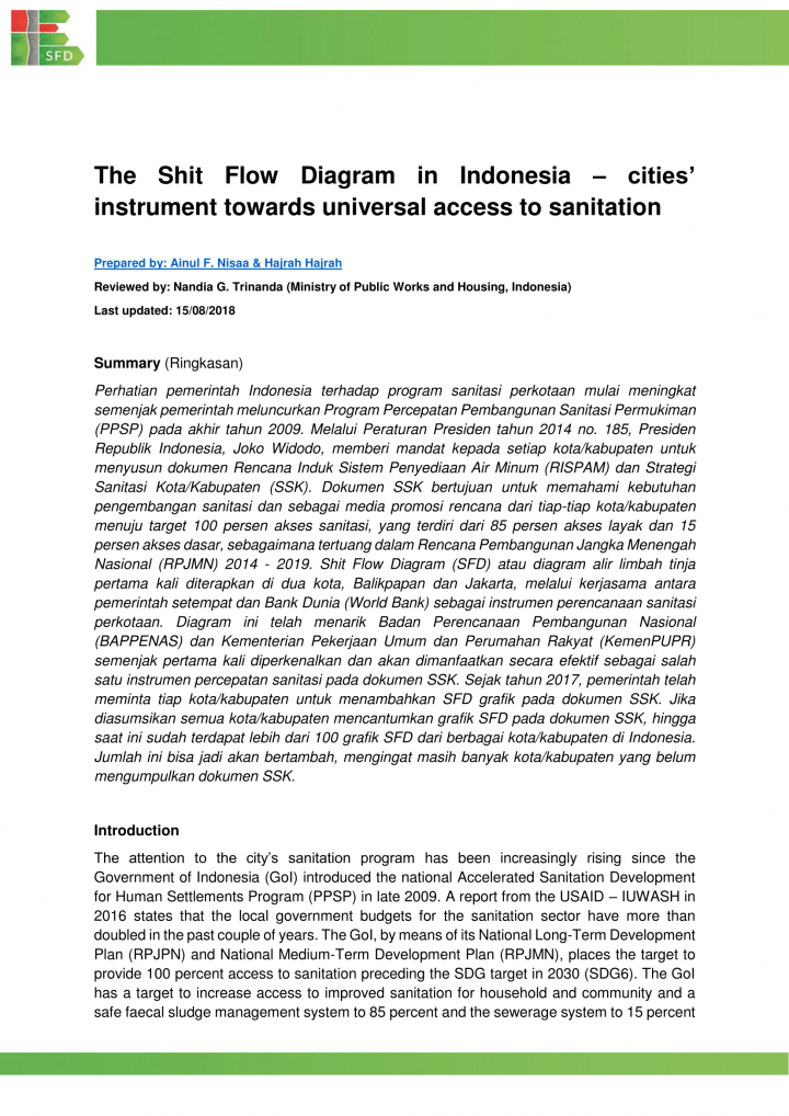 Since 2017, each city/regency in Indonesia has been requested to incorporate an SFD graphic into the respective sanitation strategy document (SKK). Within 2017 already 134 cities and regencies submitted the SKK and . according to the Ministry of Public Works, another 46 documents from cities and regencies were expected in 2018. With the total number of 490 cities and regencies participating in the national Accelerated Sanitation […]