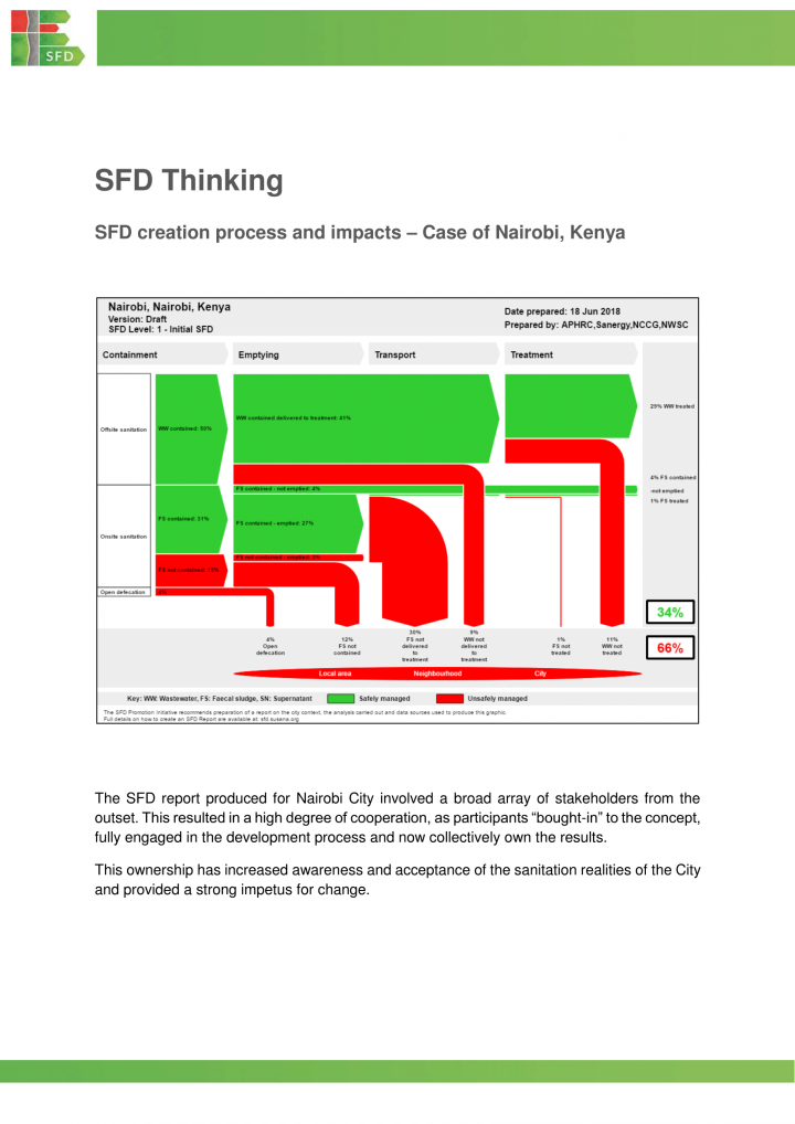 The SFD report produced for Nairobi City involved a broad array of stakeholders from the outset. This resulted in a high degree of cooperation, as participants “bought-in” to the concept, fully engaged in the development process and now collectively own the results. This ownership has increased awareness and acceptance of the sanitation realities of the City and provided a strong impetus for change.