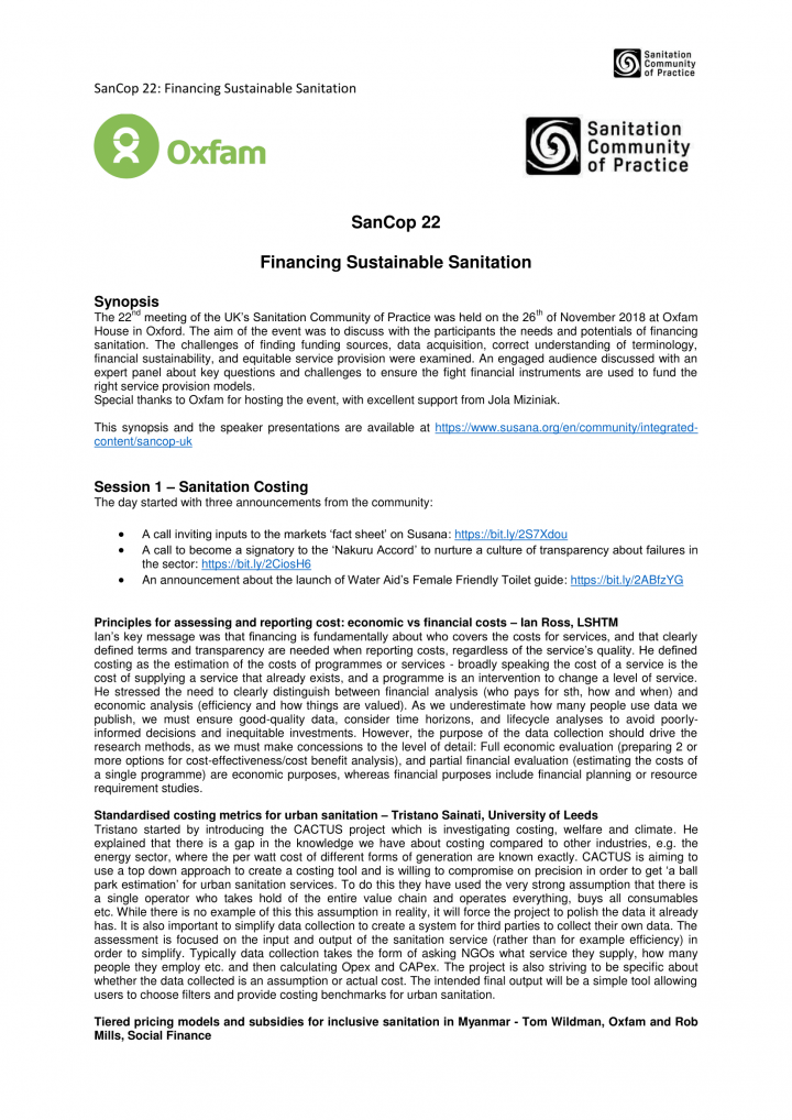 The 22nd meeting of the UK’s Sanitation Community of Practice was held on the 26th of November 2018 at Oxfam House in Oxford. The aim of the event was to discuss with the participants the needs and potentials of financing sanitation. The challenges of finding funding sources, data acquisition, correct understanding of terminology, financial sustainability, and equitable service provision were examined. An engaged audience discussed […]