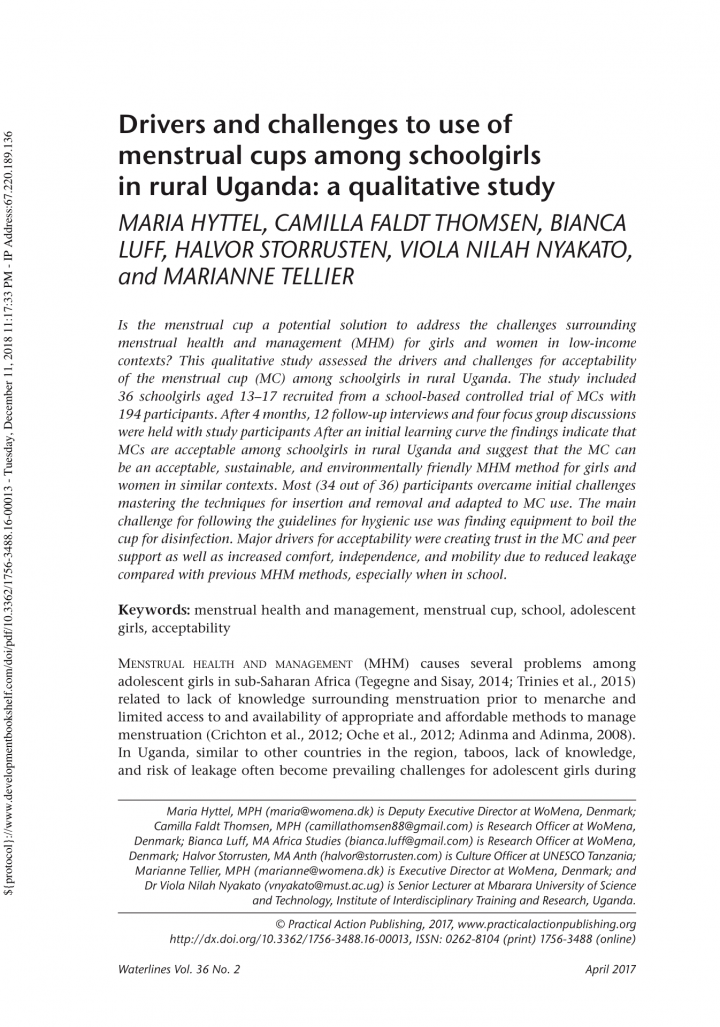 Is the menstrual cup a potential solution to address the challenges surrounding menstrual health and management (MHM) for girls and women in low-income contexts? This qualitative study assessed the drivers and challenges for acceptability of the menstrual cup (MC) among schoolgirls in rural Uganda. The study included 36 schoolgirls aged 13–17 recruited from a school-based controlled trial of MCs with 194 participants. After 4 months, […]