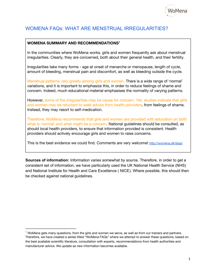 In the communities where WoMena works, girls and women frequently ask about menstrual irregularities. Clearly, they are concerned, both about their general health, and their fertility. Irregularities take many forms - age at onset of menarche or menopause, length of cycle, amount of bleeding, menstrual pain and discomfort, as well as bleeding outside the cycle. Menstrual patterns vary greatly among girls and women. There is a […]