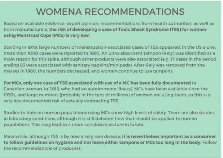 WOMENA RECOMMENDATIONS The risk of developing Toxic Shock Syndrome (TSS) for women using Menstrual Cups (MCs) is very low. In 1979-80, large numbers of menstruation-associated cases of TSS appeared. In the US alone, more than 1000 cases were reported in 1980. An ultra-absorbent tampon (Rely) was identified as a main reason for this spike, but many other products were also associated, for example 17 cases were associated with […]